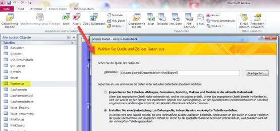 Sie verknüpfen die Tabellen der Datendatei in die Urkunden.mdb. Dies geschieht in der Vorlagen.mdb im Ribbon "Externe Daten" und dem Button "Access". Wichtig ist auch, dass Sie verknüpfen (und nicht importieren) wählen.