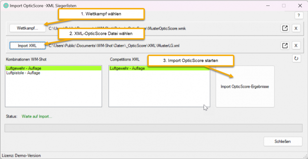 Über ein Tool "Import OpticScore" können XML-Ergebnislisten in WM-Shot Wettkämpfe importiert werden.